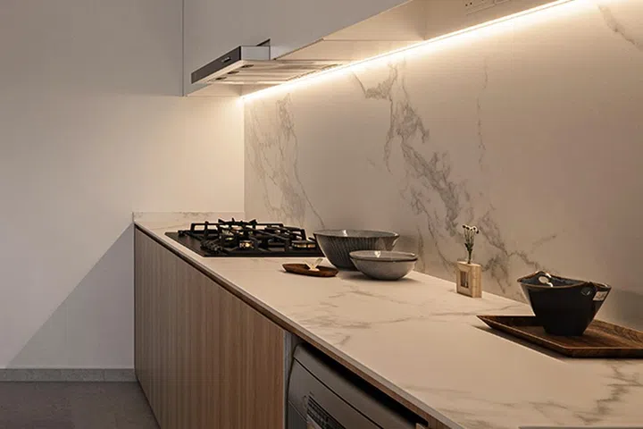 When kitchen interiors utilise wall-mounted cabinetry and other shelving systems, having downlights as your sole source of illumination may be insufficient. Lining shelves with LED strips will eliminate shadows and provide a well-lit artistic display for your collections.