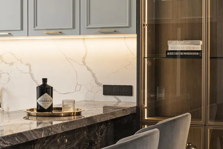 Pictured above, concealed lighting was installed here to gently illuminate the counter top. It also serves an aesthetic purpose and highlights the grains of the marble slab we had chosen for as the backsplash feature. A strip of lighting runs along the borders of the glass door cabinet to make it look as if it was lit from within. Strip lighting can be a more elegant solution than installing a downlight at the top of it, which only illuminates the top shelf.