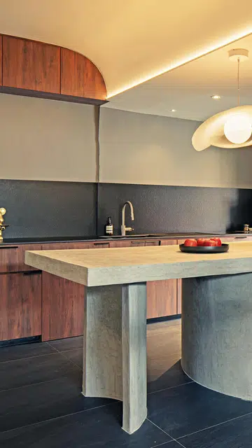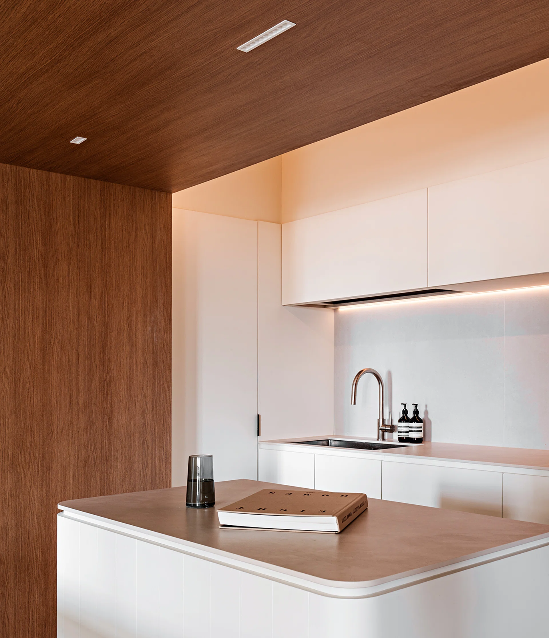 This kitchen did away with wall-hung cabinets for floating shelves. Not only does create the appearance of a wider space, it allows the owners to display their decorative objects and curated kitchen and tableware. To ensure they’re shown off in their best light, concealed lighting was installed under the shelves, the gentle illumination creating a flattering glow.