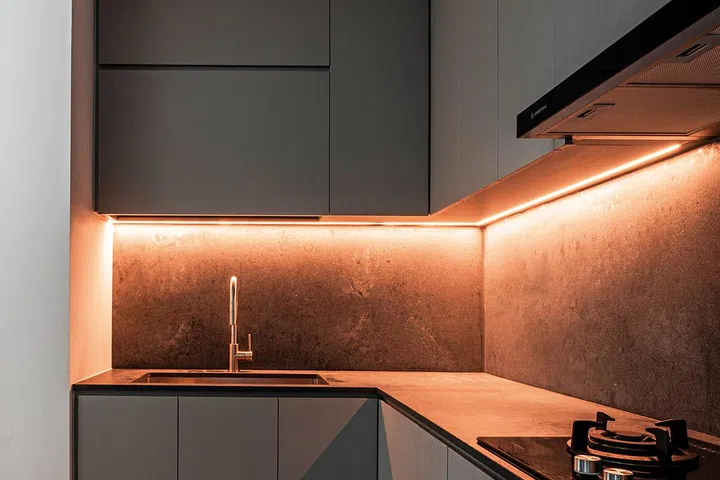 Concealed lighting is a straightforward solution to a darker-toned kitchen with grey cabinets and a charcoal- toned backsplash with not much natural light. Installing concealed lighting stretching the length of the L-shaped kitchen allows for better visibility when preparing food, and the continuous track creates the illusion of a larger space. Choosing a warm tone complements the kitchen palette, creating a sophisticated yet welcoming space.