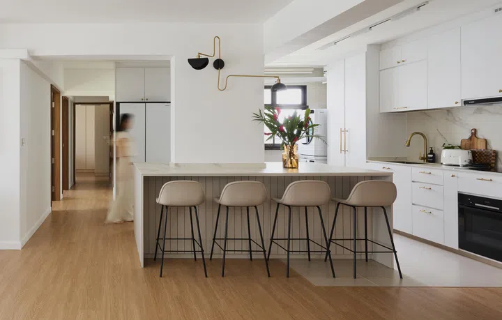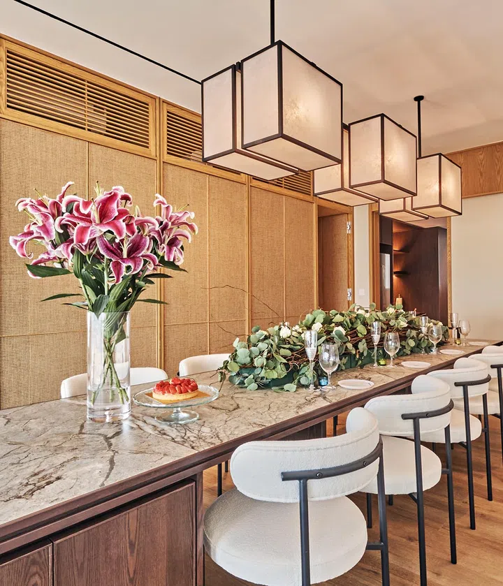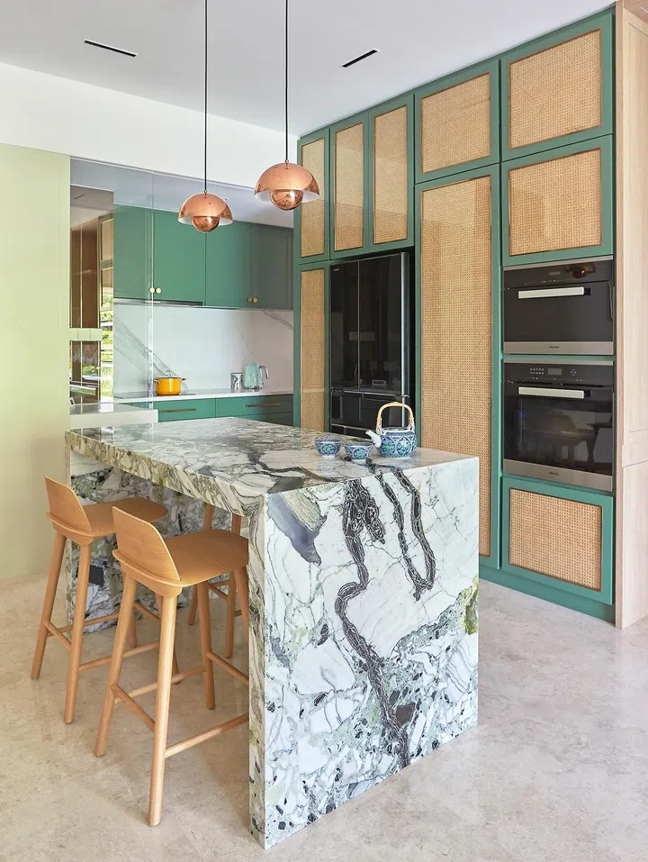 Do away with the conventional configuration—a singular row of barstools facing the cook—and instead opt for an all rounder design with chairs encircling the island on three sides. If you have the room to spare, opt for a circular island with soft rounded corners to further emphasise the organic flow of the space