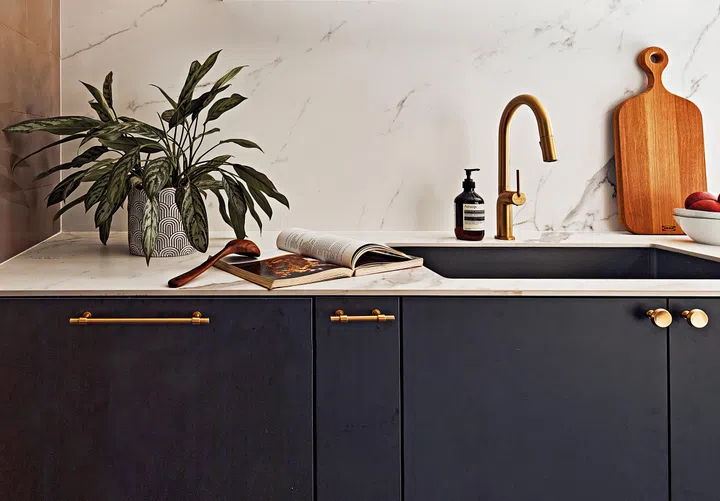 Metallic fixtures are not a new revelation, but they remain a popular choice for the kitchens of 2026—in particular, hardware in gold and brass hues. Accent your kitchen with the luxurious gleam of brass or gold, a fantastic partner for a variety of colour schemes that range from off-whites to deep blues. The sky is the limit, with gold being an easily-matchable colour: think lighting fixtures, cabinet handles, cookware, decor and accessories, faucets and taps, and more.