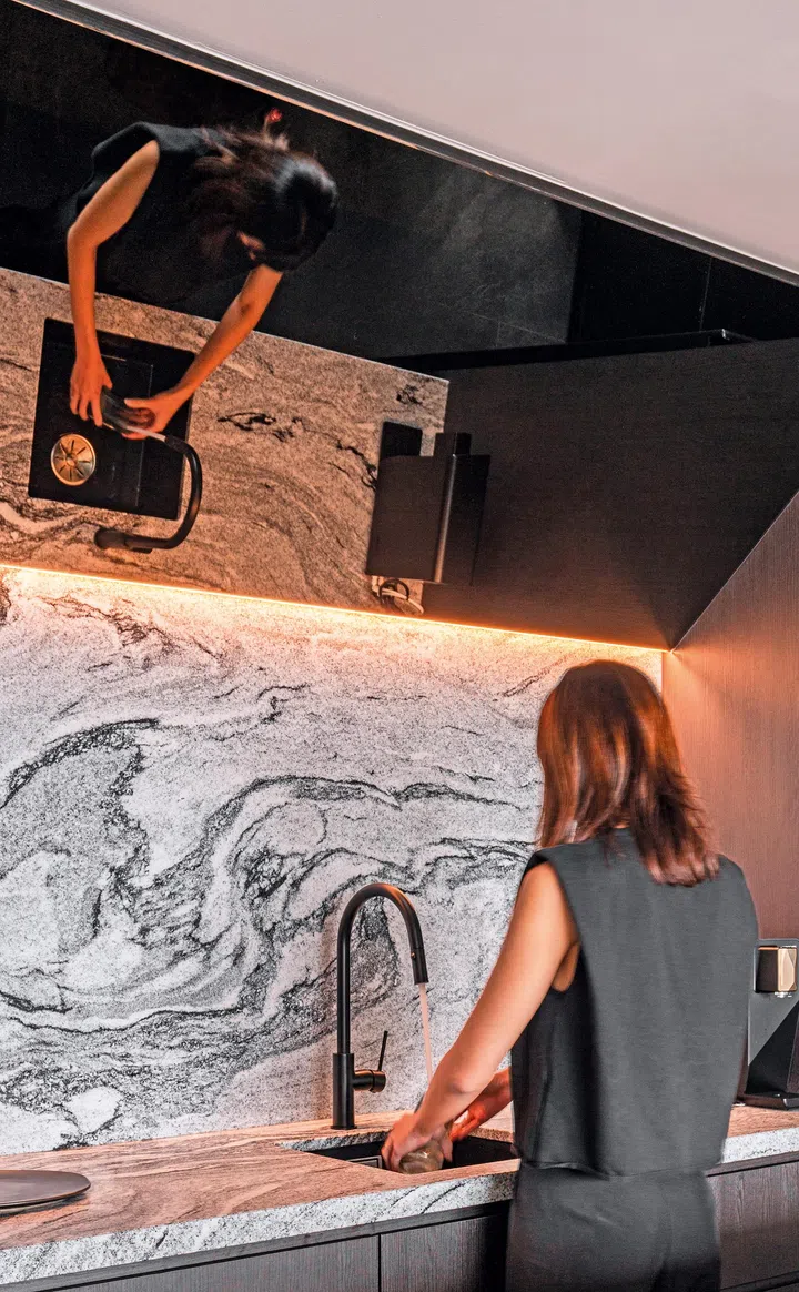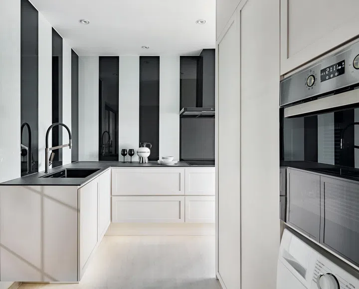 Beyond the aesthetic refinement it can provide in elevating a kitchen’s design, a mirror can also provide functional utility. In the case of smaller kitchens, a mirror can be the perfect solution for opening up the space, visually expanding it to make it feel both larger and airier.