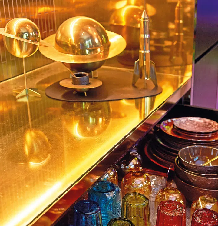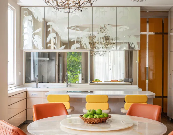 Mirrored cabinet panels create visual depth, helping your kitchen to feel less enclosed while imbuing your design with modern refinement. Extend the mirrored surfaces to the walls to give your kitchen an expansive feeling.
