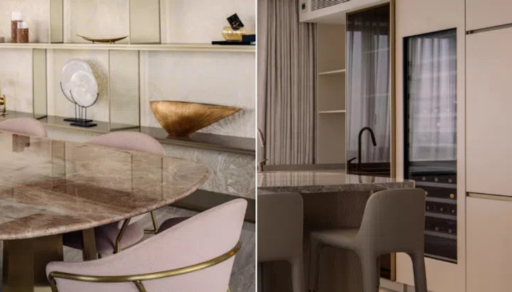 At its centre is a Gaggenau-integrated wine fridge with a glass display, flanked by bespoke cabinetry that showcases fine glassware and decanters. While the rest of the fridge is clad in finishes that match the surrounding cabinetry, the wine collection takes pride of place – subtly spotlighted without overwhelming the space.