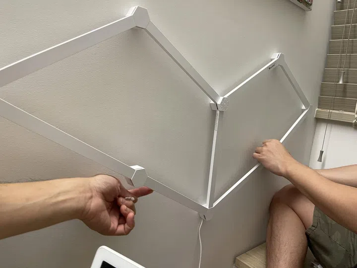 Time to mount! The instructions strongly recommend that you put up the entire assembled structure at once, so it would help to have an extra pair of hands help with the mounting. Again, the process was simple. The rear surface of each connector node comes with mounting tape, which you can expose by peeling off a protective layer. Make sure you turn your structure over and remove the protective peel from all the connector nodes before mounting your structure. The adhesive tape is strong, and the light strips are, well, fairly light (pardon the pun), so the whole mainframe stays on well if mounted properly. We used measuring tape and the iPhone’s nifty measure app to ensure that the lights were level and centralised.