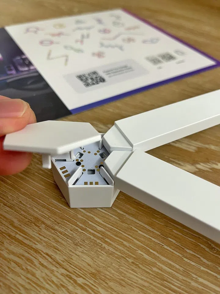 What we essentially needed to do was to first form the nine light strips into the structure we wanted on a wide, flat surface. We chose to do this on the floor. The strips join up with one another at an angle by snapping onto hexagonal nodes. The nodes can then be capped up to conceal the joints, and to create a smooth, seamless surface across the final structure. All you need to get your desired pattern fixed up is some patience (in aligning the modules at the right angle before snapping them into the connectors) and some steady hands.