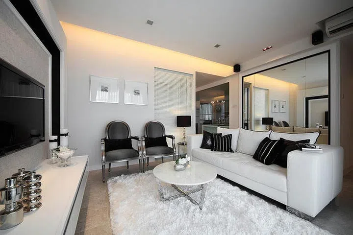 The sleek, minimalist all-white sofa and coffee table are complemented by accent chairs finished in rattan.