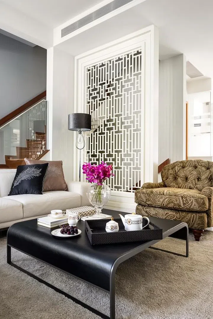 Louis-style armchairs add classic luxe to this space, when combined with the modern linear sofa.