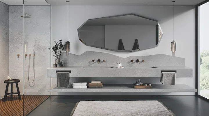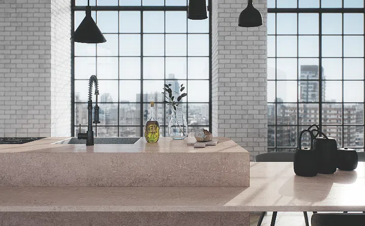 Exposed brick walls and concrete screed flooring lend an edgy or industrial-chic look to a home. However, many homeowners who like this style choose not to use materials like these in wet areas like kitchens and bathrooms, due to their porous properties. The solution: Quartz countertops. Non-porous and resistant to heat and mould, quartz can be engineered to feature raw- and distressed-look finishes, and even look like marble.