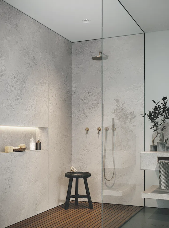4023 Topus Concrete is inspired by fossil textures and mineral formations; the rugged patina conveys a sense of depth, while the hint of warm pink is a nod to the interior design industry’s love for timeless pastel hues. This option is ideal for bathrooms with a contemporary style. To complement it, go for wooden shelving and/or decking with a natural finish.