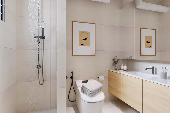 The bathrooms combine accessibility with timeless design. Featuring wide, easy- to-clean tiles that visually expand the space, this setup includes wheelchair access and lifted basin cabinetry for effortless upkeep. By leaving pipes exposed, the design not only saves on cost but also maintains a practical, streamlined look that will stand the test of time.