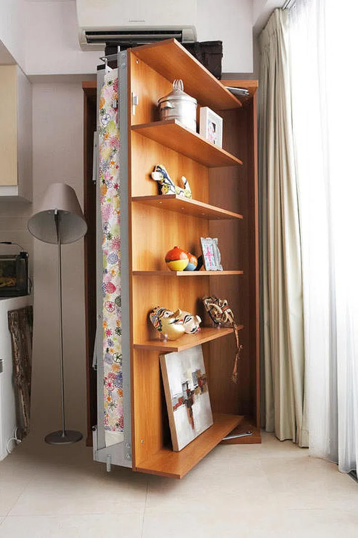 If space does not allow a bookcase, consider a semi-sheer curtain you can draw across the room in the evening. Or, consider freeing up space for a proper study area by installing a fold-up or murphy bed. The bed can fold up into a bookcase, so the footprint can be used as a work or sitting area.