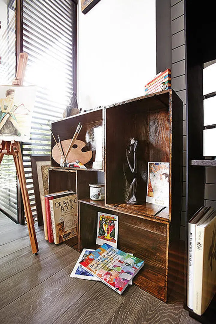 Industrial-style elements in a home office study room in an Eclectic Modern Classical 3-room condominium in Singapore.