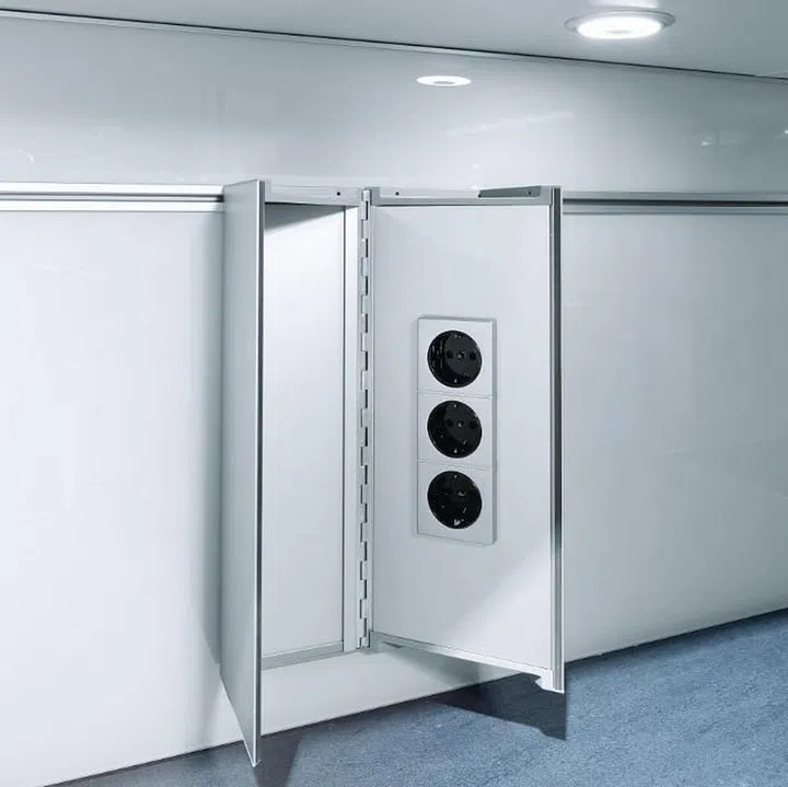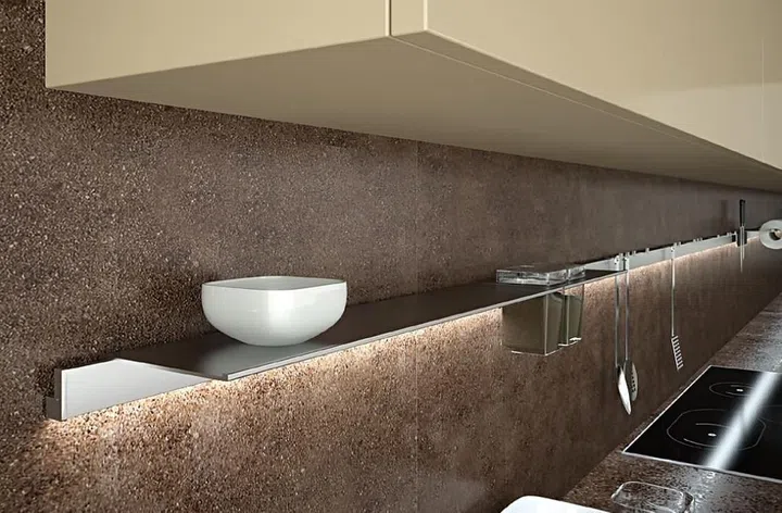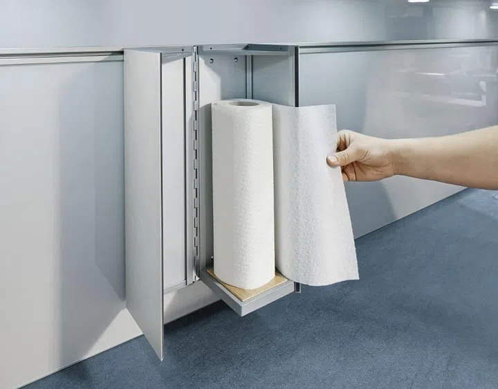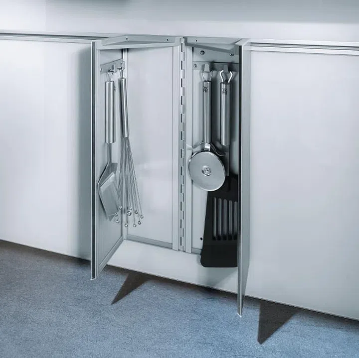 Aluminium accessories, such as shelves, hooks, containers and a paper towel holder, can be attached to the top of the horizontal "ribbon" strip.