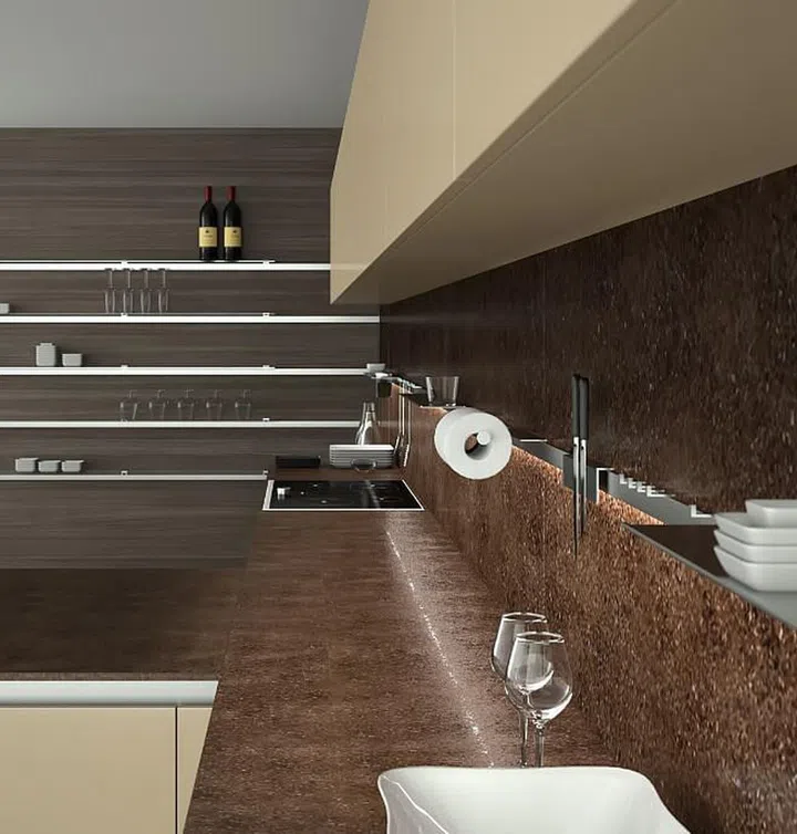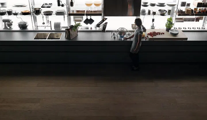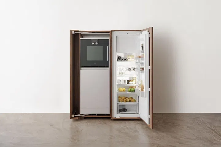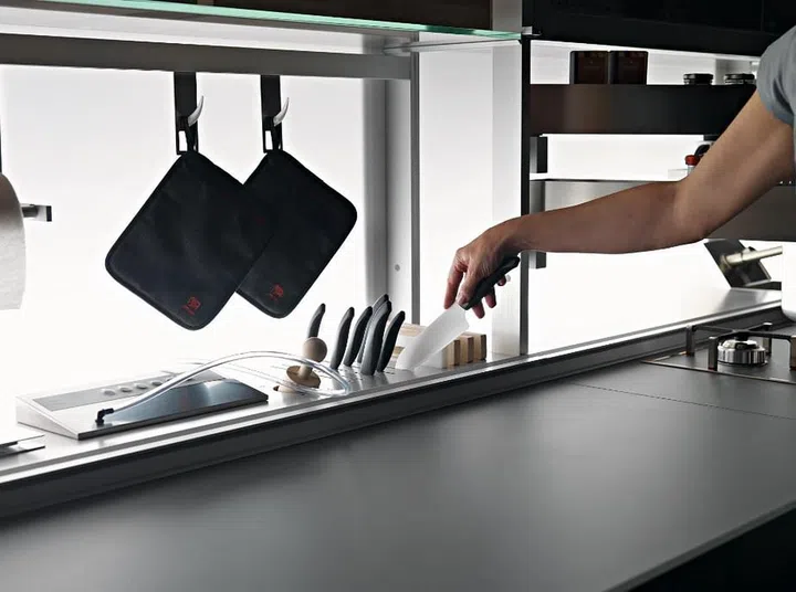 New Logica by Italian brand Valcucine, available at Roberto Design, features upper lift-up doors and lower downward-sliding doors that conceal a fully fledged kitchen back panel.