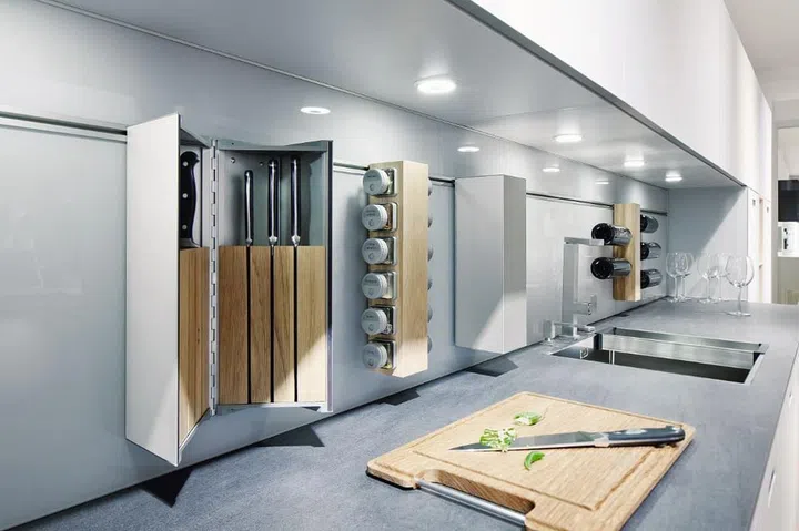 German brand Next125 has launched Cube, available at W Atelier, a modular kitchen organisation system that includes magnetic knife blocks, suspended shelves and multiple socket outlets.