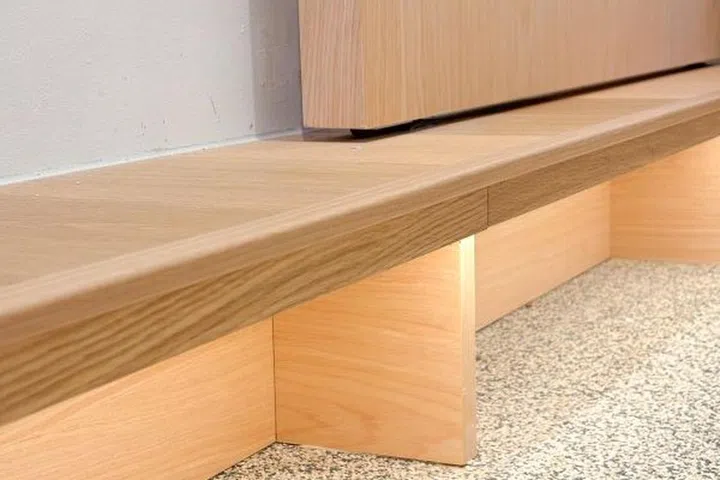 A creative raised platform extends to create additional space, while serving as a designated area to remove shoes before entering the house. Photo: Muji