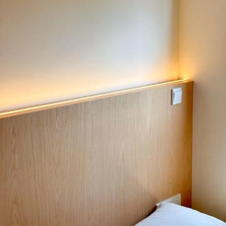 Minimal carpentry but functional aesthetics is seen in this headboard with accent lighting in the bedroom. Photo: Muji