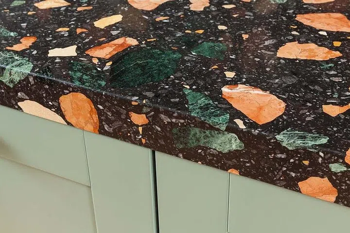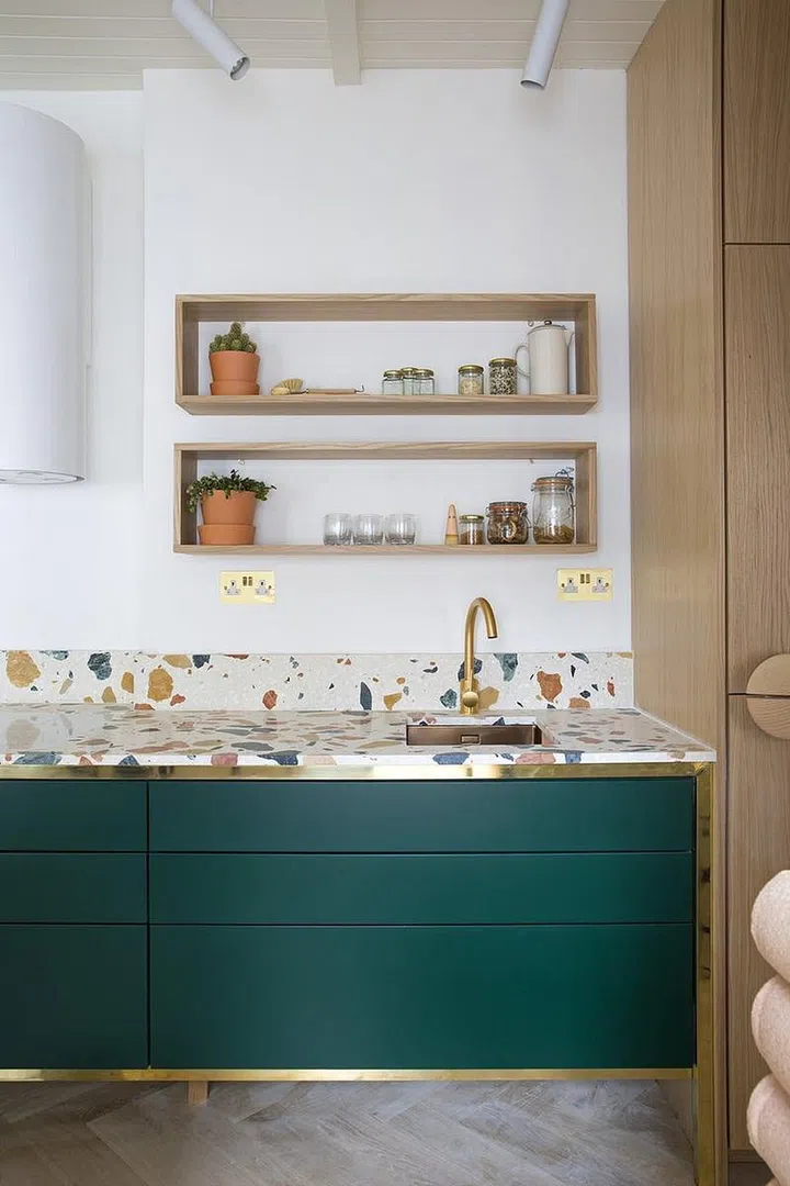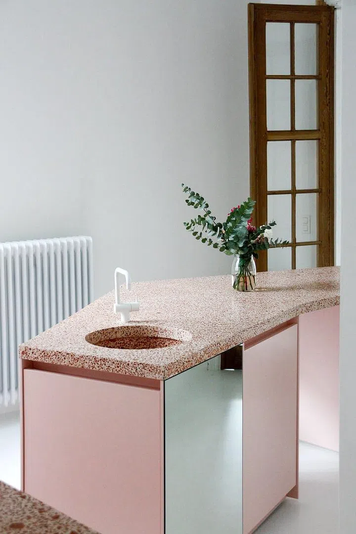 Today, terrazo is not only used as flooring. It can also be used on various surfaces, from countertops (such as this lovely kitchen counter) to walls and tables too.