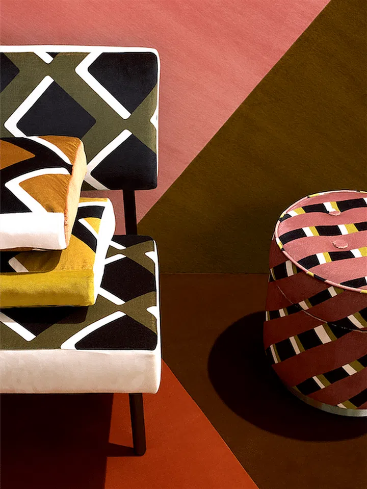 (Photo: Pierre Frey, in collaboration with stylist Anne Pericchi- Draeger, designed this collection (background), which offers a chic, ethnic look.)