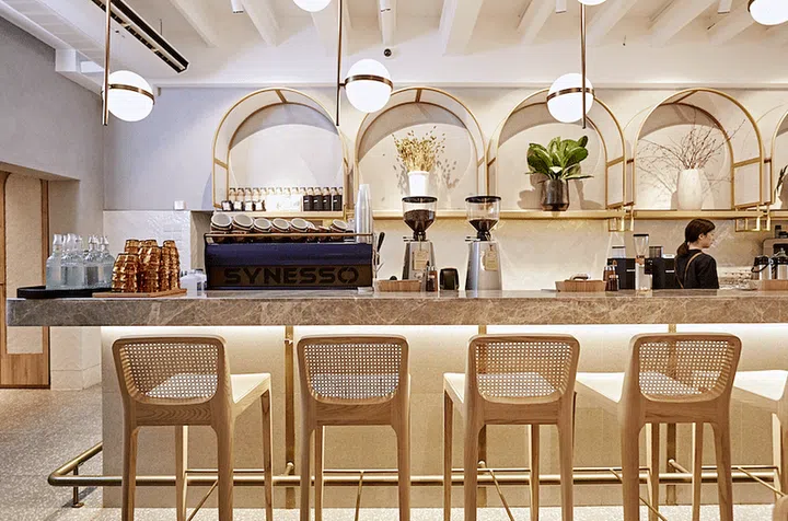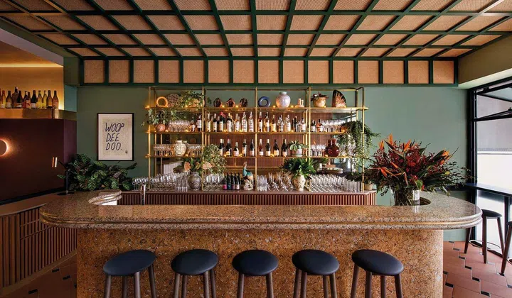 Asylum, the design firm who designed Common Man Stan (pictured), said Common Man owner Harry wanted a light-hearted yet sophisticated dining ambience. "An Australian milk bar is typically decked out in marble countertops, so we used brass and stone finishes to create a luxurious look and -- inspired by the surrounding location -- rattan weaving for a local touch,” they share.