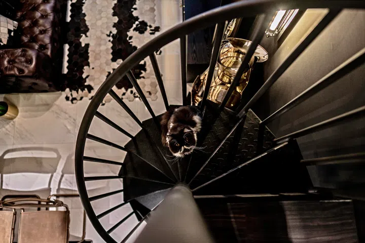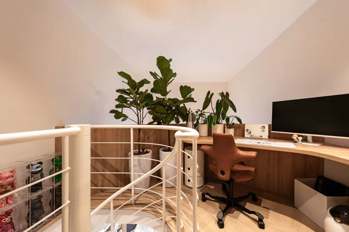 This loft, however, was designed to be a sculptural, treehouse-like element that stands out within the apartment, complete with a spiral staircase that echoes the loft’s circular form.
