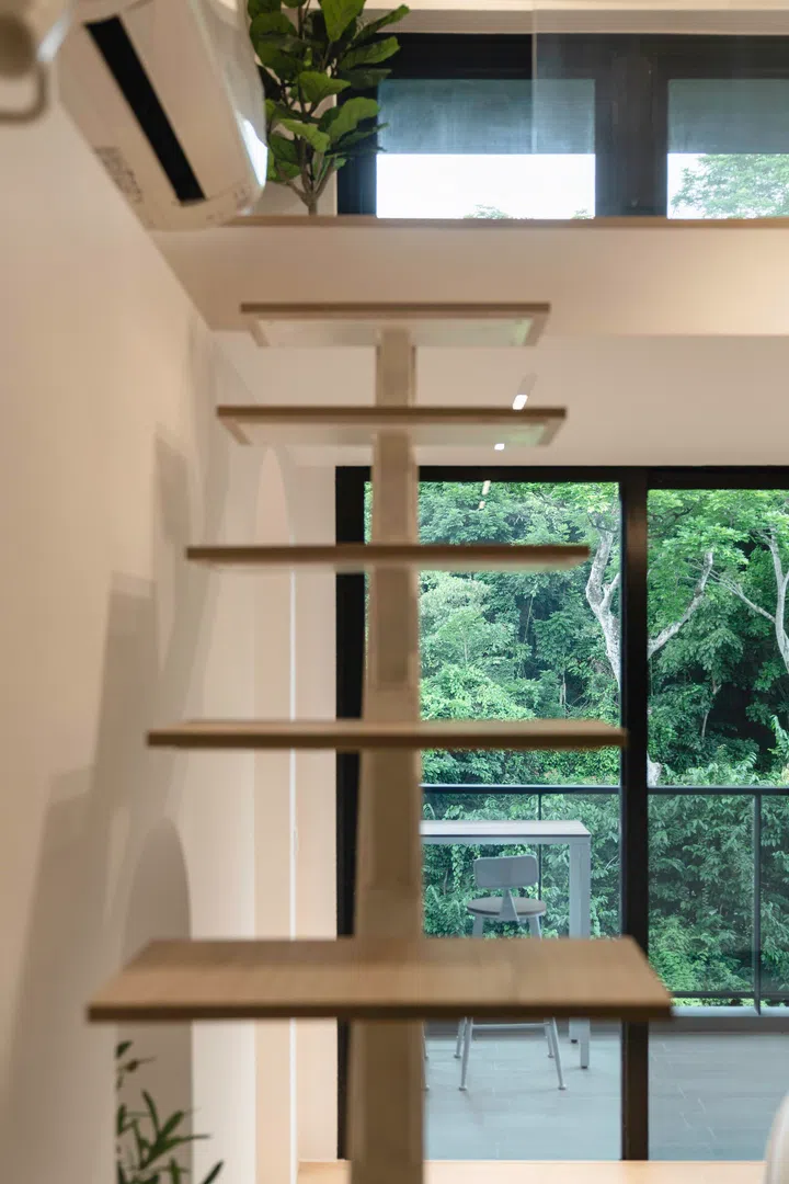 Besides the configuration, opting for an open-riser staircase helps to preserve the openness of the compact apartment and avoid obstructing the view of the surrounding greenery.