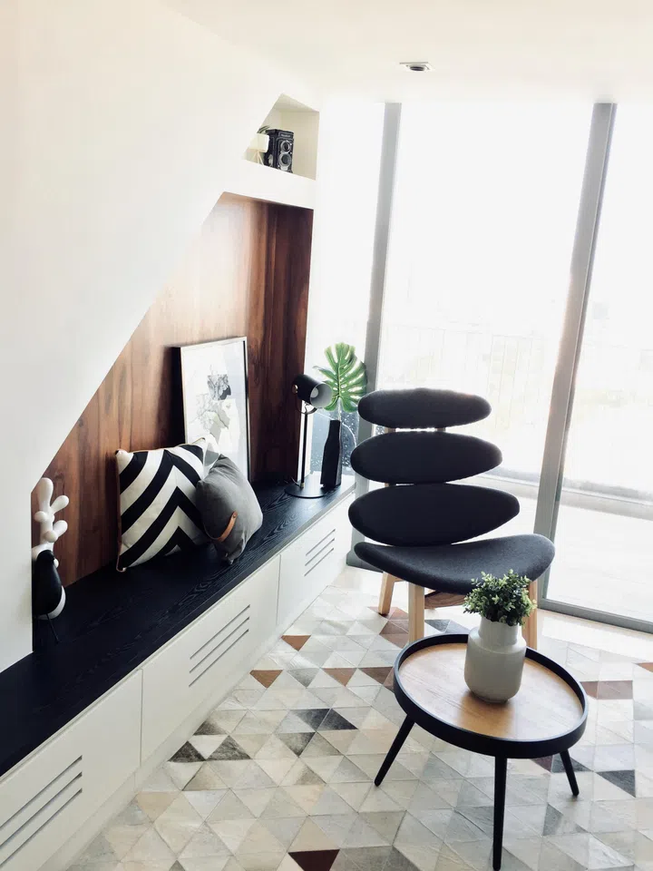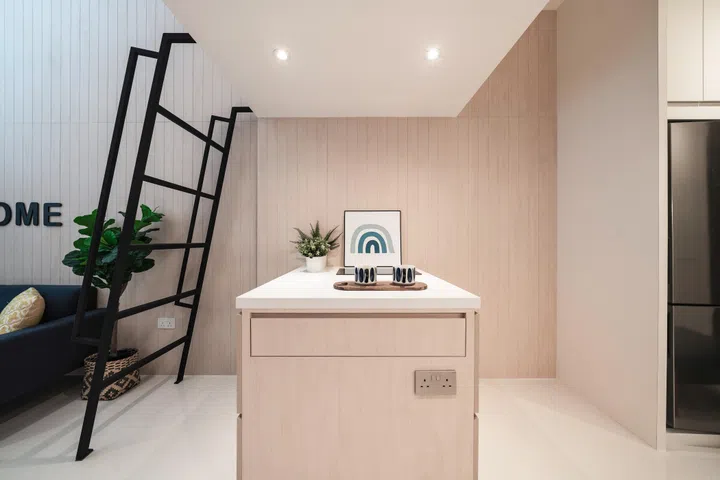 Since the size of a loft is restricted to no more than 5 sqm, a little bit of ingenuity goes a long way in maximising the efficiency of the compact loft space. In this example, a bar counter has been integrated with the loft railing to save space through its dual purpose.