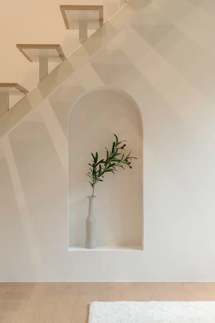 While many homeowners choose to maximise storage space by incorporating it into the loft staircase, the under-staircase area in this home was given an aesthetic twist with a contemplative arched display niche.
