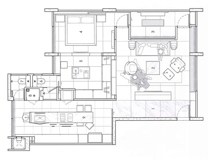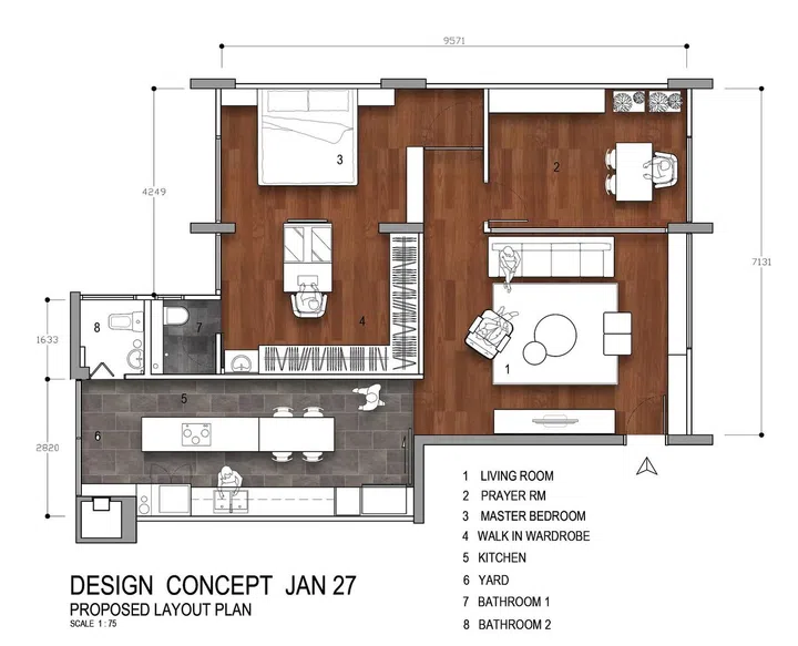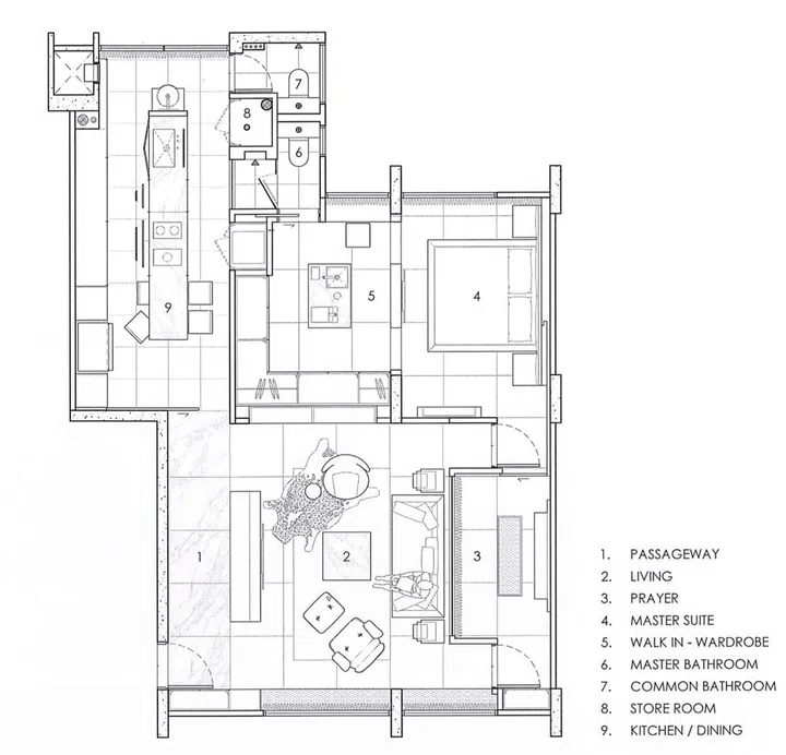 - The wall between the prayer room and the living area is replaced with a glass wall.