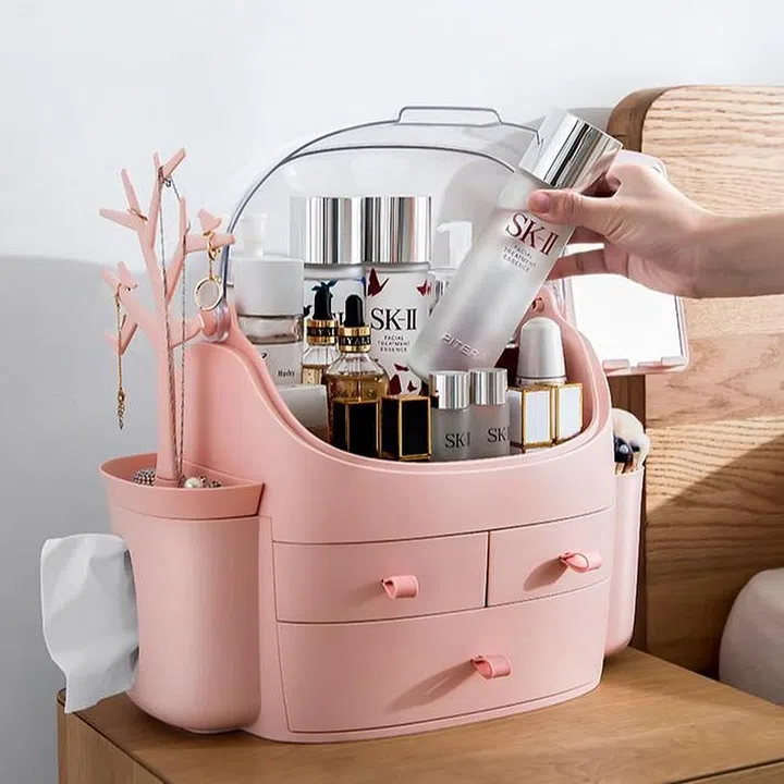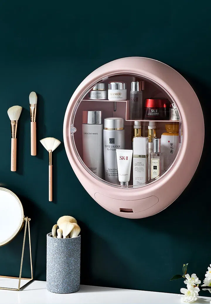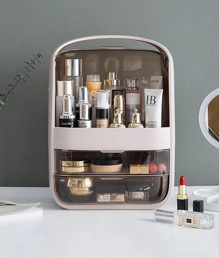 A portable makeup organiser with clear lid and handle, perfect for grooming-on-the-go. Waterproof, dustproof and it comes in millennial pink that goes well with your contemporary sensibilities.
