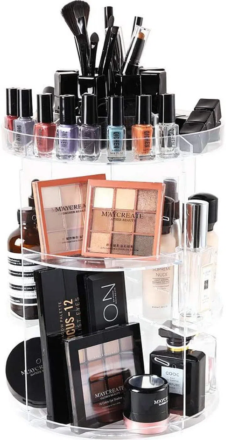 Features a 360-degree rotating design, so you can simply spin it to access all of your beauty products for a more efficient makeup routine. Also features adjustable layers enable you to custom the desired height of trays. Holds at least 30 makeup brushes and 20 bottles of skincare products, and other makeup accessories with ease while keeping your countertop, dresser and vanity tidy and clean.