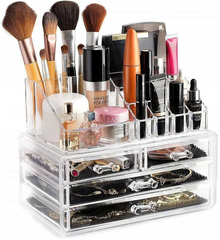 The classic and practical clear organiser featuring open compartments and four drawers. Made of clear acrylic, this organiser is also suitable to place in the bathroom.