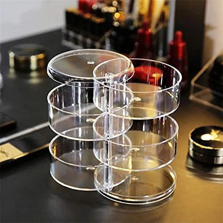 This one rotates in and out of an axis to present its tiered content with minimal interruption. Handy if you need to move the whole storage - simple close it tight and carry. suitable to use as jewellery storage too.