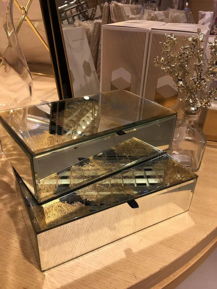 11. Mirrored boxes. These have a very basic design, but it's the mirror and gold leaf finishing that give it a subtle luxe look.