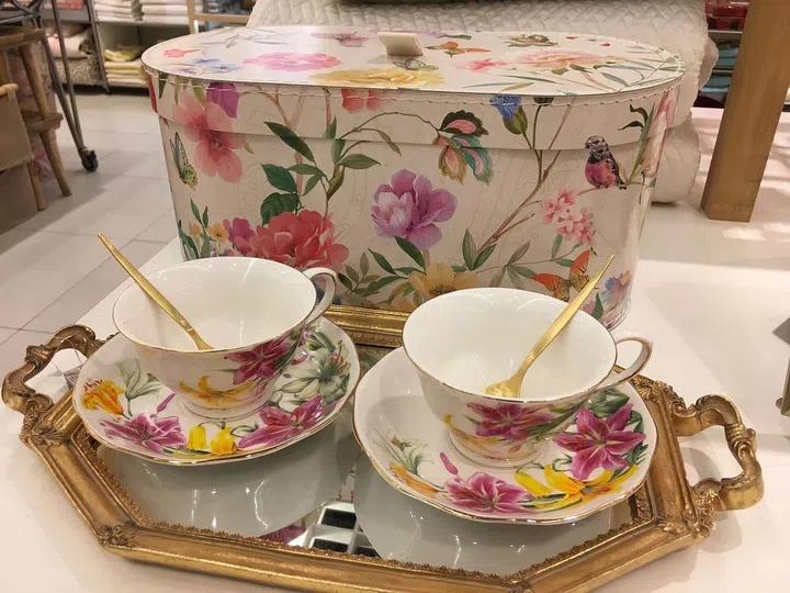 4. This teacup and saucer set comes with a gorgeous mirrored tray, and beautiful packaging, too. It'll make a great gift!