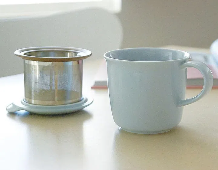 A convenient porcelain tea mug with a stainless steel strainer inside so you don’t need a separate tea pot. The large strainer results in a richer and a fuller-bodied tea, while the lid of the mug acts as a strainer rest.
