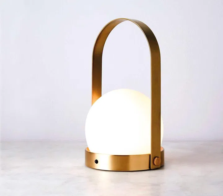 Carry your glow wherever you go. A tribute t the Danish tradition of hygge, this dimmable LED lantern features a steel or brass frame with a handsome, industrial look. Pick from four brightness settings that last up to five hours when fully charged.
