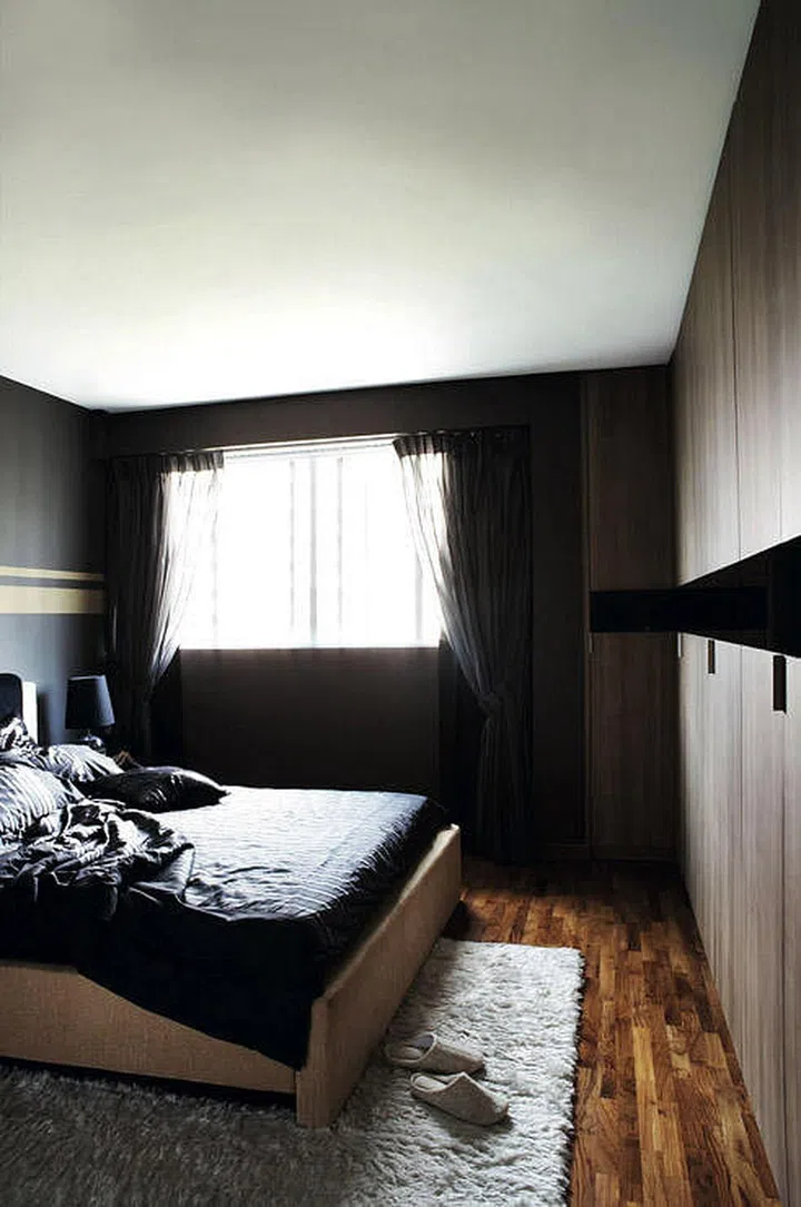 Dark brown and warm wooden tones also add a sense of calm and warmth to the sleeping area.