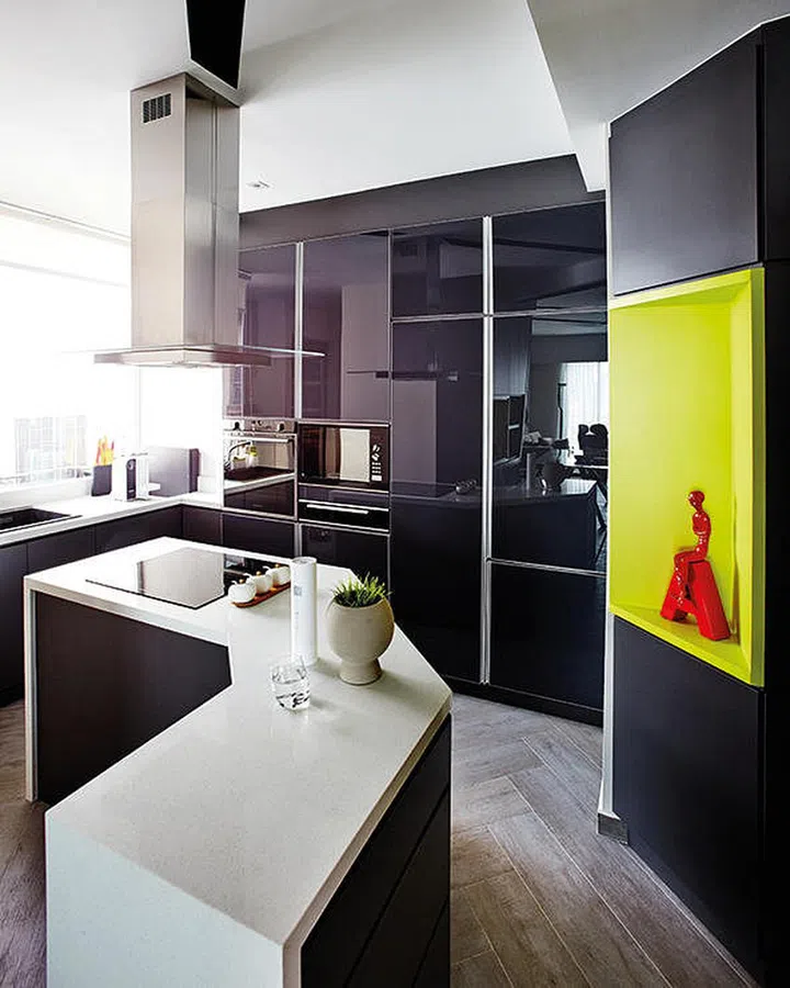 Glossy black laminates work well to amp up the luxe factor in the kitchen. Juxtapose it with some matt and colourful accents for a more contemporary vibe.