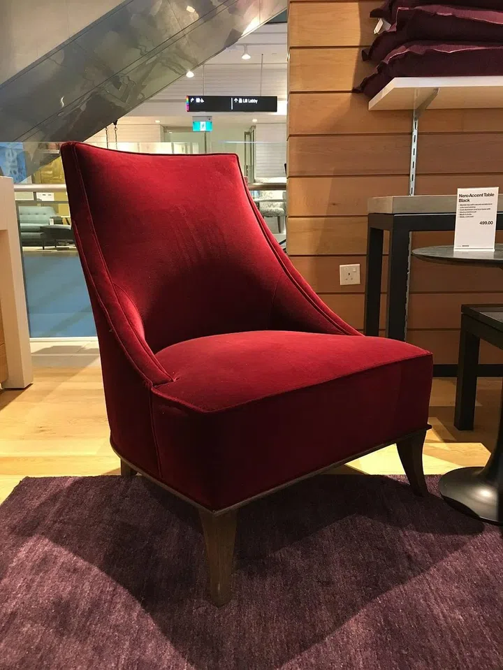 11. The velvet-like upholstery in ruby red on this chair makes it look so luxurious. A jewel-tone piece will instantly glam up any space!