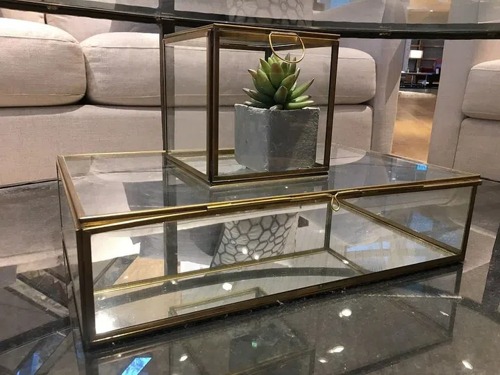 10. These are simple but beautiful brass-framed glass boxes for displaying mementos and decor objects. They have mirrored bases, too, for more lustre.