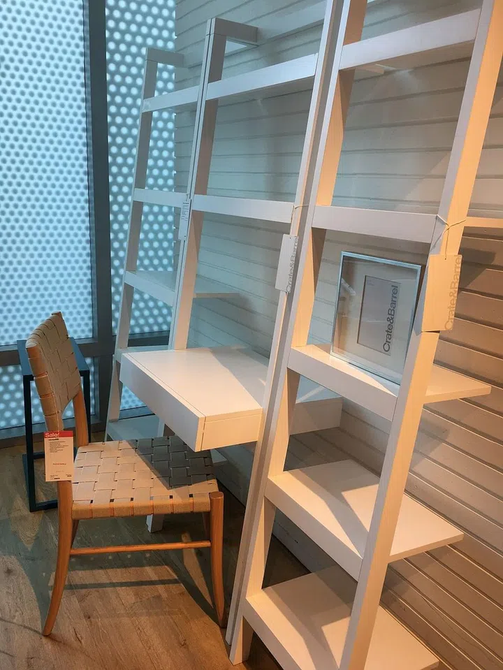 1. This compact ladder-inspired shelving integrates a desk — great for small spaces or an open study area. Or just use the desk as a sideboard or larger display area!