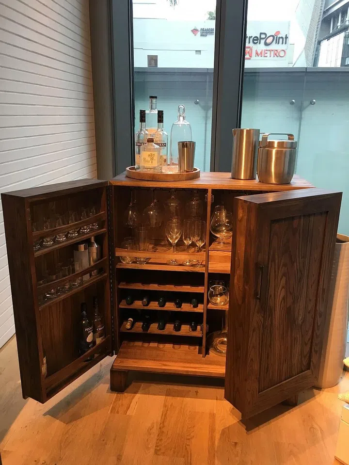 2. A discreet bar cabinet — awesome for a man cave! All your bar essentials can be neatly stowed away with this. Its made of solid weathered elm with a dark finish.