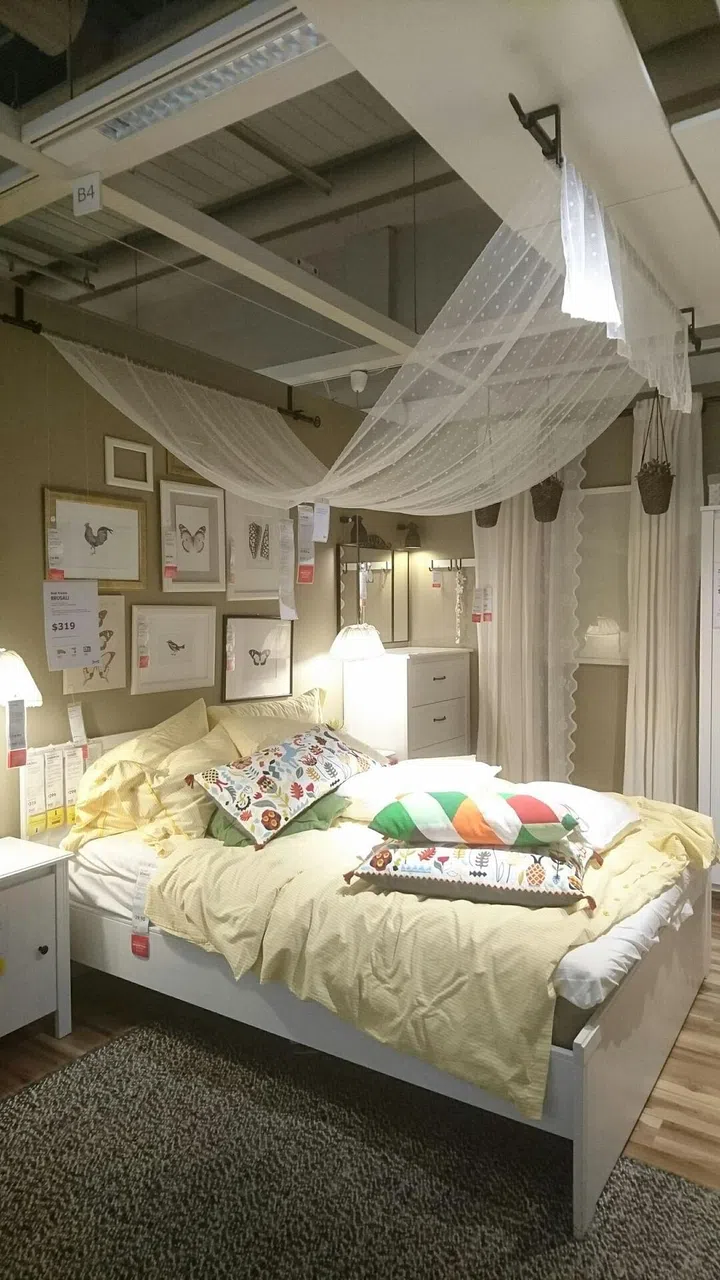 Create a dreamy and romantic-looking bedroom by installing a canopy of white muslin fabric over your bed. Just drape the fabric over suspended curtain poles on your ceiling.
