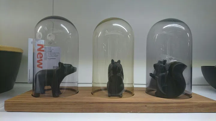 An unexpected find at Ikea - the Harliga set of three glass domes with a wooden base ($29.90), to display your treasures with. The animals are sold separately.