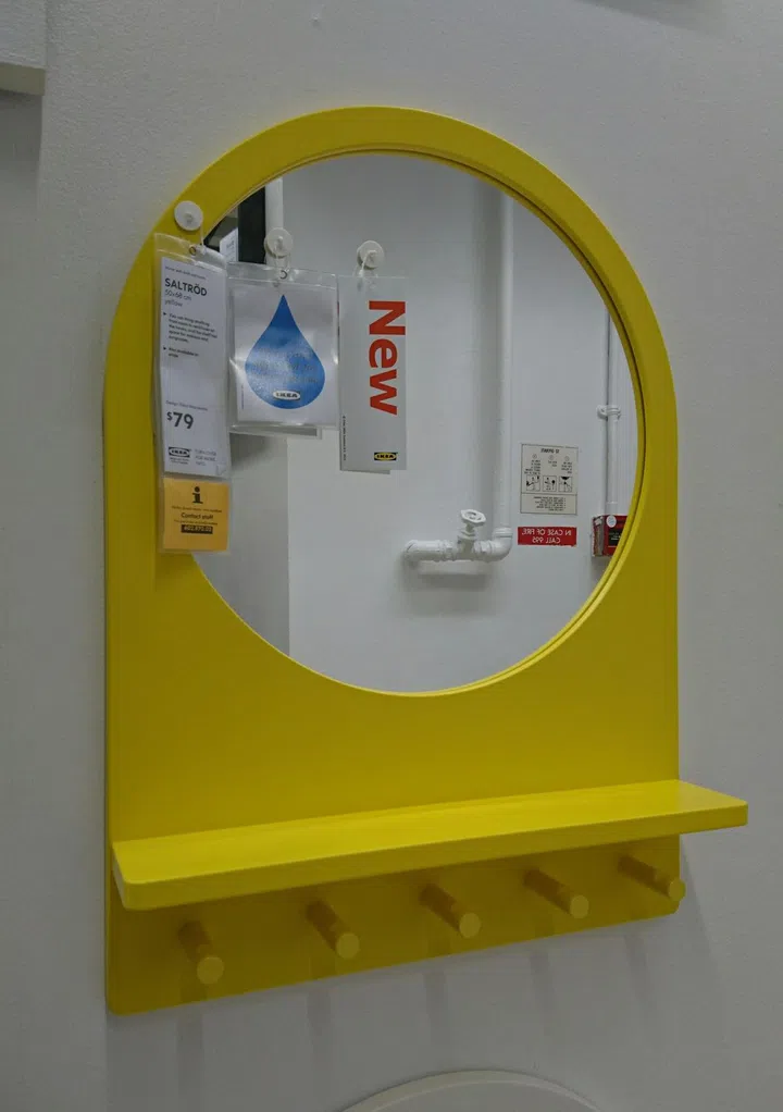 One product in Ikea's 2017 catalogue is the Saltrod mirror with shelves and hooks. It's $79, and only comes in yellow. We hope this will be a bestseller, and more colours will be released next year!