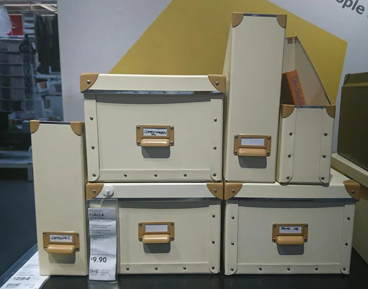 These Fjalla storage boxes remind us of old leather trunks, with their capped corners and labels. Available in five colours and different sizes.
