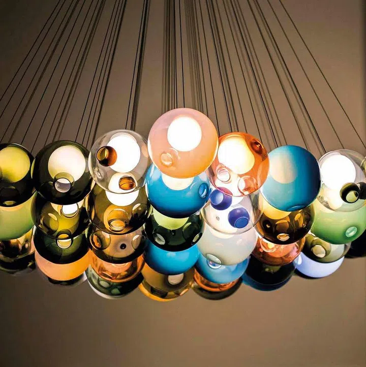 A coaxial cable links Bocci’s Series 28 cluster of colourful blown glass spheres that delights both kids and adults. There are several options available.